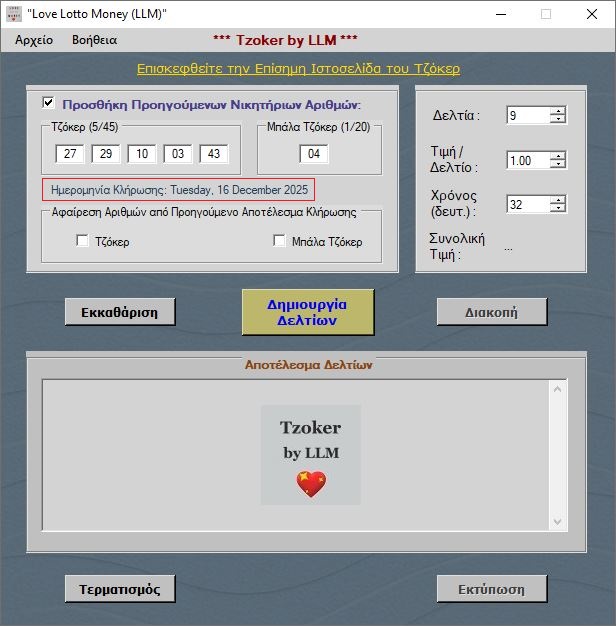 • Λειτουργικό Σύστημα: Windows XP / 7 / 8.1 / 10 / 11 • Framework: .NET 4.x ή νεότερη έκδοση • Διαδίκτυο: Απαιτείται για ενημερώσεις ζωντανών κληρώσεων